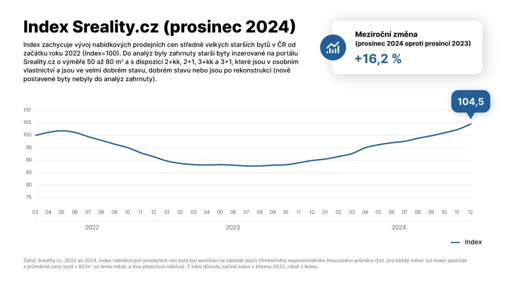 Středně velké starší byty na konci roku citelně zdražily. Od září do prosince roku 2024 stoupla jejich cena meziročně o 16 procent. Vyplývá to z aktuálních dat portálu Sreality.cz a nového Indexu Sreality.cz, který sleduje vývoj nabídkových cen středně velkých starších bytů v celém Česku.
