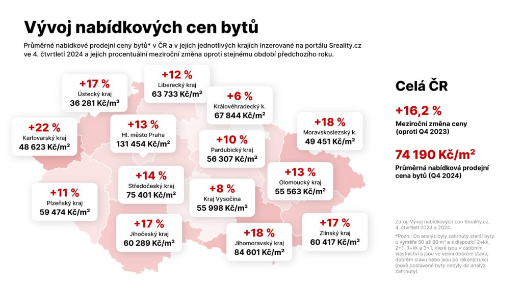 Rekordmanem je Karlovarský kraj, kde se nabídkové ceny meziročně navýšily o pětinu. Jihomoravský a Moravskoslezský kraj pak zaznamenly zdražení o 18 procent. Nejméně rostly ceny bytů v Královéhradeckém kraji (o šest procent) a na Vysočině (o osm procent). K propadu cen ovšem v žádném z krajů nedošlo.