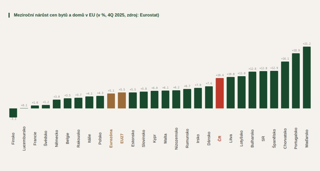 V Česku i na Slovensku patří bydlení dlouhodobě mezi klíčová společenská témata, zejména pokud jde o vývoj cen, dostupnost bydlení a výstavbu nových nemovitostí. Ceny bytů a domů ovlivňuje celá řada faktorů, především vztah mezi nabídkou a poptávkou, výše úrokových sazeb u hypoték, lokalita nebo celkový ekonomický vývoj. Jak si Česko stojí v porovnání s ostatními zeměmi Evropské unie? Více už v analýze od Evy Sadovské, analytičky WOOD & Company, k nejnovějším datům Eurostatu za poslední čtvrtletí 2025.