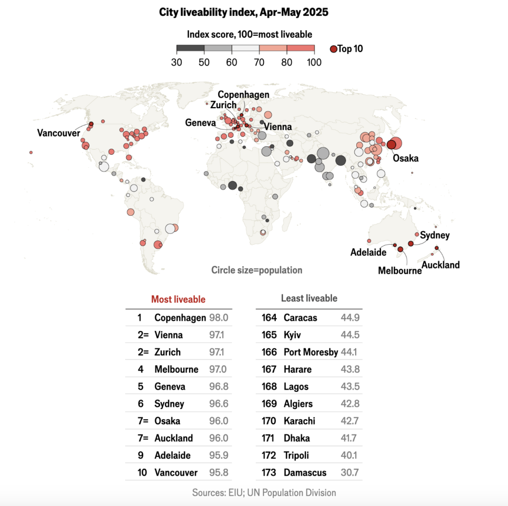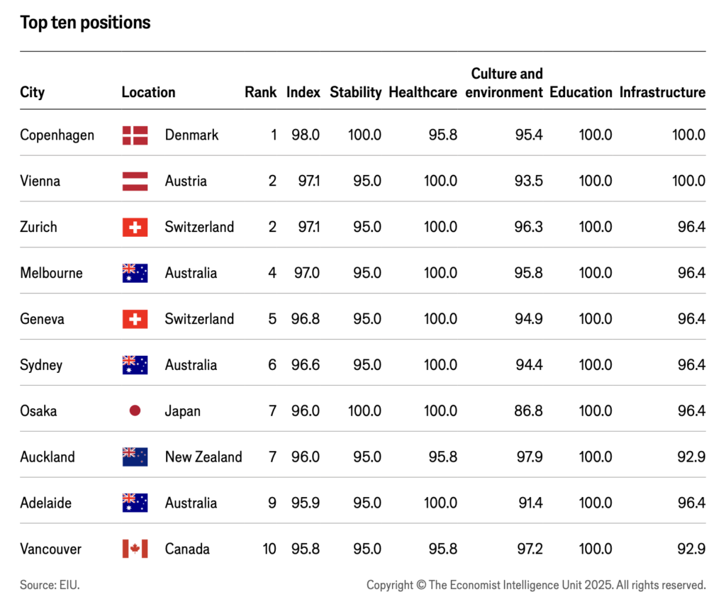 - Kodaň sesadila Vídeň z první příčky a stala se nejlepším městem pro život. Získala plný počet bodů (100) za stabilitu, vzdělání a infrastrukturu.