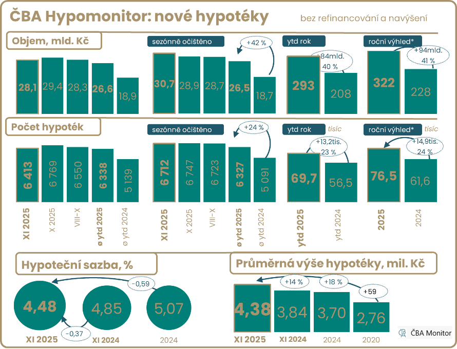 Pokud hypotéky udrží dynamiku z posledních dvou měsíců, tedy za říjen až listopad, letošní objem nových hypoték bez refinancování by podle asociace mohl dosáhnout 322 miliard Kč. To je přes 40 procent více v porovnání s loňskem, což je nezměněný výhled z posledních měsíců.