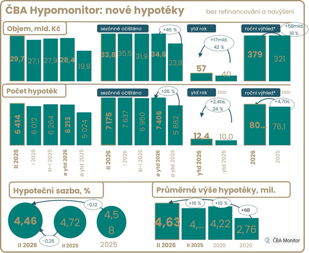 Průměrná úroková sazba u nových hypoték byla v únoru o 0,26 procentního bodu níže než sazba 4,72 procenta před rokem, což snižuje měsíční splátky hypotéky přibližně o 0,7 procenta čistého příjmu žadatele, tedy o 700 Kč. Pro srovnání průměrná hodnota hypoteční sazby v roce 2025 dosáhla 4,58 procenta v porovnání se sazbou 5,07 procenta v roce 2024.