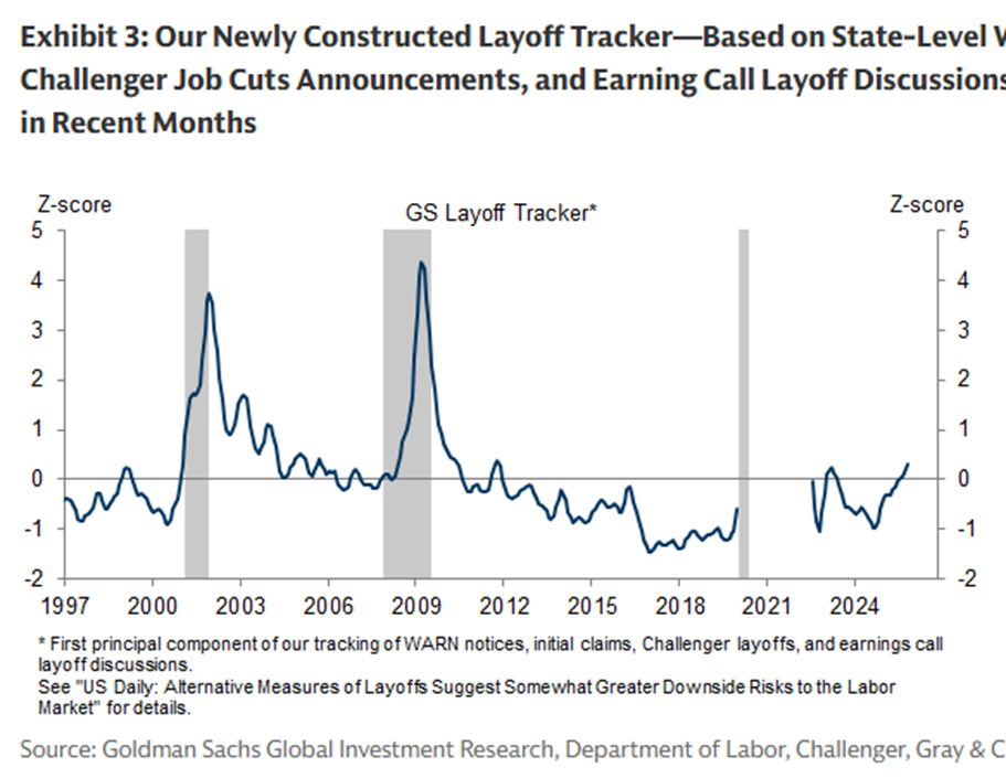 Například Národní report zaměstnanosti od pracovní agentury ADP nepřinesl kdovíjak dobré zprávy. Oslabující dynamiku trhu práce potvrdily i některé nově vzniklé indikátory vynucené shutdownem. Naposledy nás zaujal ukazatel americké banky Goldman Sachs. Opírá se o Challenger Report sledující plánovaná propouštění a o povinná oznámení firem podle zákona Worker Adjustment and Retraining Notification Act (WARN), v jehož rámci musí zaměstnavatelé hlásit hromadné propouštění či uzavírání provozoven. Dále zahrnuje i vyjádření z konferenčních hovorů k výsledkům hospodaření amerických firem.