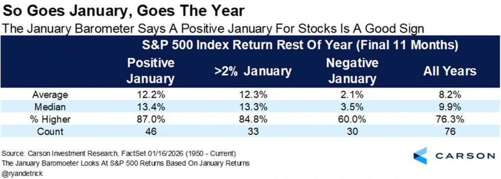 Americké akciové trhy mají za sebou mimořádně silné období. Index S&P 500 v posledních třech letech dělal investorům radost nadprůměrnými výnosy, když v roce 2023 vzrostl o 26 %, v roce 2024 o 25 % a loni přidal dalších více než 15 %. Ani začátek letošního roku zatím neztrácí dech. Za první čtyři týdny roku 2026 si index připsal přibližně 2 %, což mezi investory znovu otevírá otázku, zda existuje přímá souvislost mezi výkonem trhu v lednu a jeho výsledkem na konci prosince.