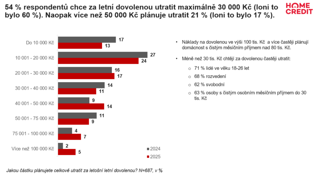 „Z realizovaného průzkumu vidíme, že 21 % Čechů plánuje utratit za letní dovolenou více než 50 000 korun, což představuje nárůst oproti loňským 17 % respondentů. Maximální útratu 30 000 korun plánuje 54 % dotázaných, přičemž v loňském roce to bylo celých 60 %. Stejné výdaje jako v předchozím roce očekává 52 % oslovených, 28 % Čechů očekává, že za letošní dovolenou utratí více než loni, naopak 21 % předpokládá nižší útratu. Zajímavostí je, že respondenti z Prahy častěji očekávají letos větší útratu (33 %),“ vysvětluje analytik společnosti Home Credit Jaroslav Ondrušek.