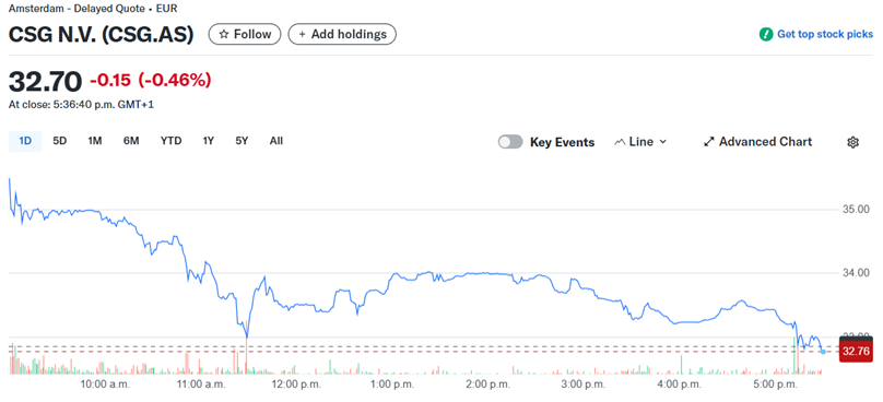 Akcie společnosti CSG po IPO cenně 25 EUR (cca 615 Kč) uzavřely včera na 32,70 EURO, což představuje nárůst o 30,8 %. Na pražské burze pak akcie CSG zavíraly na 815 korunách, což je nárůst o 34,05 % od doby emise. Během pondělního obchodování akcie na amsterdamské burze korigovaly o 6,84 %.