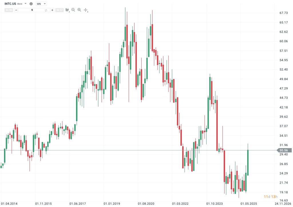 Vývoj ceny akcie INTC.US. Zdroj: xStation. Minulá výkonnost není spolehlivým ukazatelem budoucí výkonnosti.