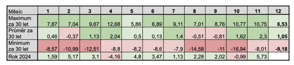Ačkoliv tedy prosinec obecně nepatří k nejúspěšnějším měsícům, historicky přinesl investorům převážně zisky. V roce 2024 byly měsíční výnosy až na tři výjimky nad dlouhodobým průměrem. Pokud tento trend bude pokračovat, je pravděpodobné, že prosinec přinese vyšší výnos než zmíněný průměr 1,05 %. Je však důležité mít na paměti, že trhy mohou překvapit jak pozitivně, tak negativně.