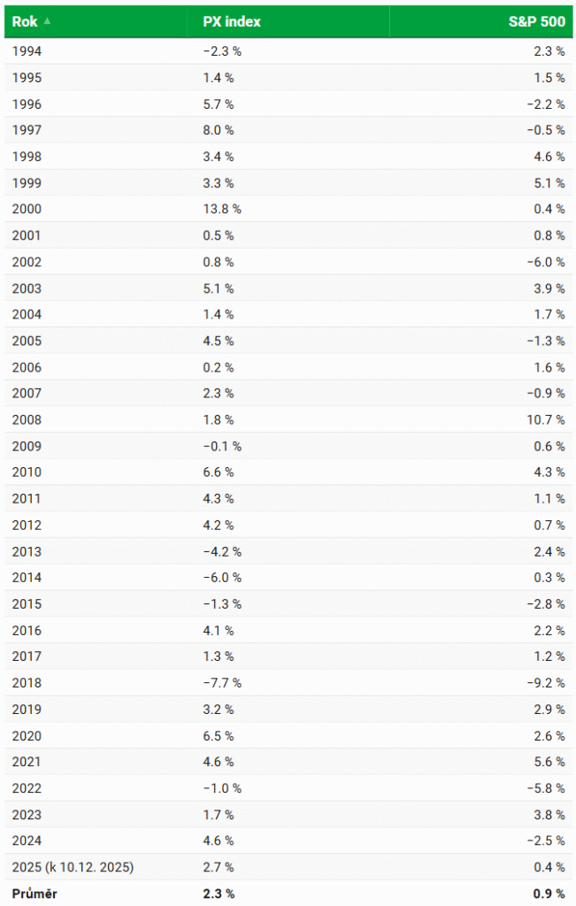 Letošní rok byl obecně velmi dobrý pro český akciový trh. Index PX k 10. 12. 2025 vzrostl o zhruba 44 %, po započtení dividend dokonce o více než 50 %, zatímco americký index S&P 500 o zhruba 16,5 %. Po přepočtení na koruny je rozdíl ještě výraznější. Posílení koruny proti dolaru upravuje letošní výkon indexu S&P 500 ze zisku do ztráty na úrovni zhruba jednoho procenta.