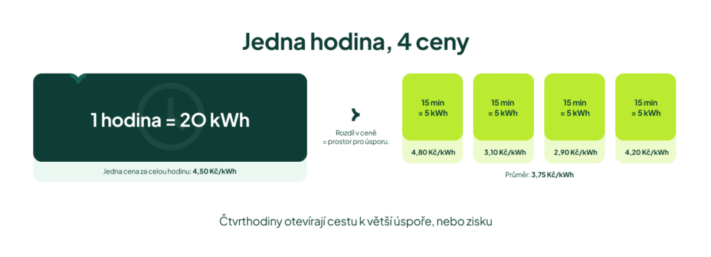 Namísto hodinových cen se každý den rozdělil na 96 čtvrthodin, pro které se stanovuje samostatná cena. Dříve platilo, že spotřeba např. 20 kWh se během jedné hodiny nacenila jako jedna souhrnná hodnota. A ať už se elektřina odebírala kdykoli v rámci konkrétní hodiny, platila pořád stejná cena. Nyní se jedna hodina rozdělí na čtyři různé ceny. Pokud spotřeba zůstane rovnoměrná, bude kupříkladu platit 4×5 kWh.