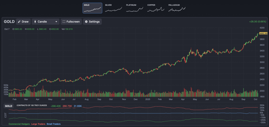 Zlato dnes poprvé překonalo hranici 4 000 dolarů za unci, konkrétně 4 008 dolarů. Hybatelem jsou především sázky na snížení sazeb Fedu, slabší dolar a rozpočtová krize v USA. Krátkodobou hybnost podporuje i v řadě několikátá série týdenních zisků a přecenění pravděpodobnosti dalších letošních poklesů sazeb, protože prostředí nižších reálných výnosů tradičně zvyšuje atraktivitu neúročeného kovu.
