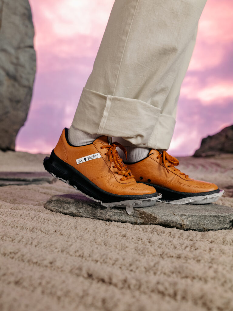 Hlavním tématem kolekce je dialog mezi českými ikonickými montérkami a japonskou workwear kulturou. Hlavním materiálem je bavlna, která je ale ošetřená speciálními enzymy během spírání tak, že působí lehce a příjemně. Tenisky Prestige x Jan z koňakové barvy kůže mají na vnitřní straně boty perforaci, aby zajistily větrání i ve vyšších teplotách.