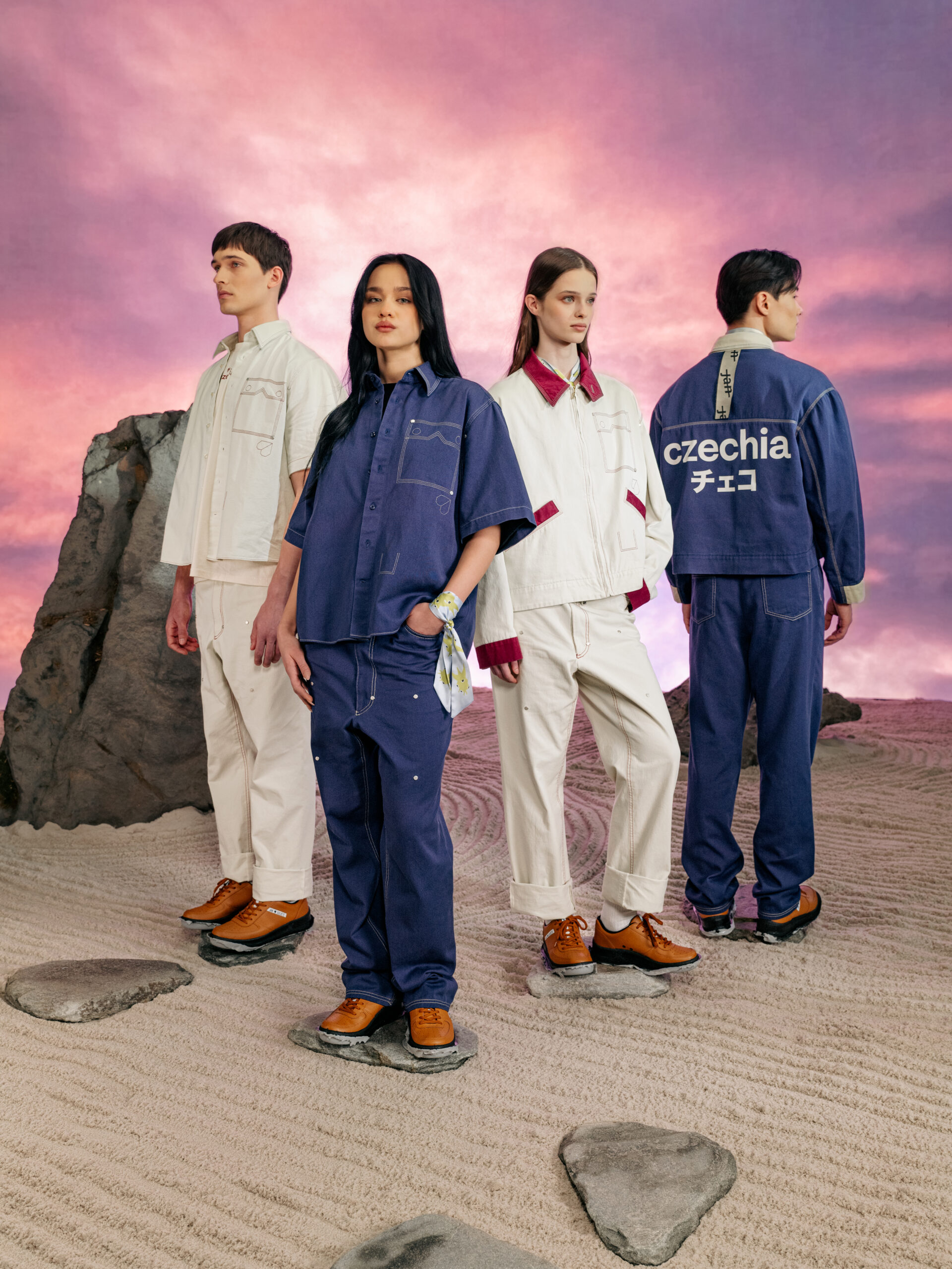„Během své rešerše, kde jsem se zabýval českou (ne)kulturou v oblékání, jsem narazil na zajímavou paralelu mezi naší a japonskou kulturou. Objevil jsem, jak blízké jsou si naše milované i nenáviděné montérky s japonským workwearem (módou inspirovanou pracovními oděvy, která je v Japonsku velmi zakořeněná do kultury odívání). Tak jsem v návrzích nechal tyto dva styly pracovních oděvů komunikovat a mluvit. Vznikly z toho tyto uniformy, které možná můžou připomínat Otíkovy montérky z filmu Vesničko má, středisková. Když je ale zasadíme do prostředí mezinárodní půdy Expa v Ósace, tato reference se najednou vytrácí a workwear siluety mojí kolekce dostávají zase úplně jiný význam. A to je jeden z faktorů, který mě na módě opravdu baví, jak moc dokáže změna prostředí a okolností změnit význam samotného oděvu,“ říká ke kolekci zakladatel a kreativní ředitel značky Jan Société Jan Černý.